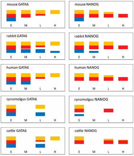 - Simmet, K.; Zakhartchenko, V.; Philippou-Massier, J.; Blum, H.; Klymiuk, N.; Wolf, E. OCT4/POU5F1 is required for NANOG expression in bovine blastocysts. Proc. Natl. Acad. Sci. USA 2018, 115, 2770–2775. [Google Scholar] [CrossRef] [PubMed]