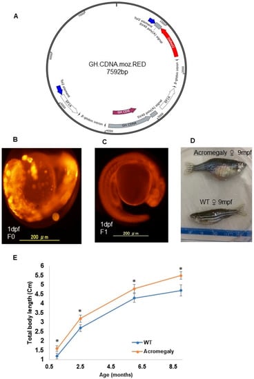 Production of the acromegaly zebrafish model overexpressing tilapia GH. (A) The structure of the GH-CDNA-moz-RED construct used to produce acromegaly zebrafish. The blue arrows indicate Tol2 transposable element. EF1A promoters drive expression of Tilapia GH cDNA and DsRed2 CDS. (B) Acromegaly zebrafish F0 generation larvae (1 dpf) showing mosaic expression of red fluorescent protein (RFP) reporter gene expression. (C) Acromegaly zebrafish F1 generation larvae (1 dpf) showing homogenous expression of red fluorescent protein (RFP) reporter gene expression in the whole body. (D) Representative female acromegaly zebrafish F1 generation (9 mpf) showing a progressive increase in growth rate compared to wild-type (WT). (E) Shown are growth curves represented as the total body length of fish recorded from one month till nine months of age between eight F1 Acromegaly zebrafish (four males and four females) and eight WT zebrafish (four males and four females). Data are expressed as the mean ± SE (n = 8). Statistical differences (t-test, P < 0.05) are denoted by asterisks. dpf: days post-fertilization, mpf: months post-fertilization.