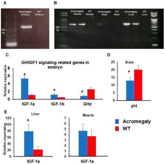 Then, we wanted to investigate whether tilapia GH was expressed in our acromegaly zebrafish model. Tilapia GH gene expression was confirmed by reverse transcriptase PCR in the first-generation (F1) three days post-fertilization (3 dpf) larvae, and F1 one-year-old acromegaly muscle and liver (Table S1 and Figure 2A,B), but not in WT larvae or one-year-old WT fish. On the other hand, endogenous zebrafish gh1 gene expression was significantly reduced in acromegaly larvae and one-year-old acromegaly brain (including pituitary gland) (Figure 2C,D), likely due to a negative feedback loop involving GH excess [20]. Using qPCR, we did not detect endogenous zebrafish gh1 in other organs in WT or the acromegaly model.