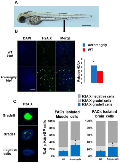 The acromegaly model and WT zebrafish larvae (9 dpf) were washed with PBS, and then fixed in 4% paraformaldehyde (PFA) overnight at 4 °C. The larvae were treated with methanol for 2 h at −20 °C to enhance permeabilization, and then washed three times in PDT (0.1% Tween-20, 0.3% Triton-X, 1% dimethyl sulfoxide (DMSO) in PBS) with gentle shaking, with a total time of 30 min per wash. The larvae were incubated in blocking solution with 5% BSA for 1 h at room temperature with gentle shaking prior to overnight incubation with rabbit H2A.X (phospho S139) antibody (Abcam; cat No.# ab81299) at a 1/350 dilution in blocking solution. To remove residual primary antibody, larvae were sequentially washed three times with PDT (30 min each wash) and then incubated again in blocking solution with 5% BSA in PBST for 1 h at room temperature with gentle shaking prior to incubation with anti-rabbit, Alexa Fluor 488 (ThermoFisher Scientific; cat. No. A-11034) antibody at a 1/150 dilution in the dark for 2 h at room temperature, and then washed three times in PDT for 30 min each. For counterstaining, larvae were incubated with DAPI at 5/250 dilution in the dark, and then stored in blocking buffer at −4 °C until examination.
