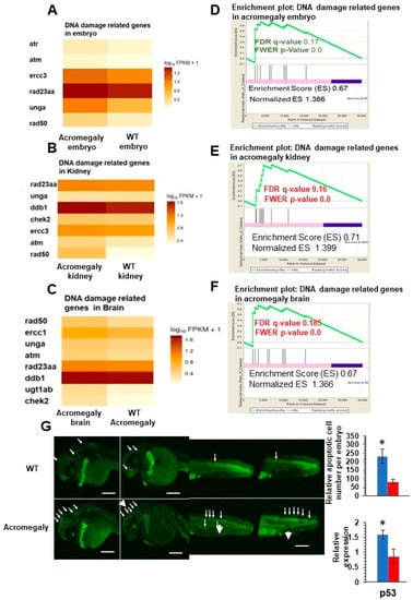 Increased DNA damage in various organs of acromegaly zebrafish model. (A–C) Heatmap of DNA damage markers in acromegaly larvae (3 dpf) (A), acromegaly kidney (one-year-old) (B), and acromegaly brain (one-year-old) (C) versus WT. (D–F) The results of GSEA showing the familywise-error rate (FWER) p-values, false discovery rate (FDR), enrichment scores (ES), and normalized ES of DNA damage markers in acromegaly larvae (3 dpf) (D), acromegaly kidney (one-year-old) (E), and acromegaly brain (one-year-old) (F) versus WT. Significant p-value < 0.05 and FDR q-value < 0.25 are written in red. According to GSEA [15], the reported p-value of 0.0 indicates an actual p-value of less than 0.01 (G) Representative Acridine orange (AO) staining and quantification of acromegaly model and WT larvae. The quantification of AO positive apoptotic cells was performed using Fiji software (left). P53 expression levels in the acromegaly model and WT larvae (right). Data are expressed as the mean ± SE (n = 3). Statistical difference (t-test, P < 0.05) is denoted by an asterisk.