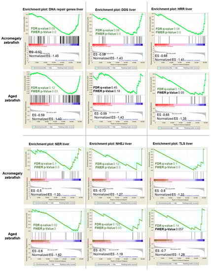 Since DNA repair pathways are fundamental for repairing DNA damage, we investigated whether GH excess also impairs DNA repair. We retrieved a set of genes involved in DNA repair activities in humans [16] and converted them to their zebrafish orthologues using BioMart. Then, we performed GSEA from the WT (one-year-old), acromegaly model (one-year-old), and aged zebrafish (three-year-old) RNA-Seq data, and we found that DNA repair genes were significantly reduced (p-value < 0.05, FDR < 0.25) in the liver of acromegaly and aged fish (Figure 5). To better dissect which DNA repair pathway was perturbed due to GH excess, we compared the expression of the genes encoding proteins involved in each of the five main DNA repair pathways: DNA damage response signaling (DDRS), homologous recombination repair (HRR), non-homologous end joining (NHEJ), nucleotide excision repair (NER), and translesion synthesis (TLS). Interestingly, the impairment of DNA repair pathways was even more prominent in the model than in aged zebrafish (Figure 5). All repair pathways were significantly downregulated in the acromegaly zebrafish liver (Figure 5), while downregulation of DNA repair pathways in other organs was not statistically significant (data not shown); however, three out of the five pathways were reduced in the aged zebrafish liver (Figure 5).