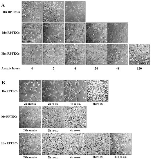 Cell imaging revealed that human RPTECs deteriorated significantly, showing condensation and loss of adherence on a very large scale, after 8 h of reoxygenation. Mouse RPTECs were even more sensitive to reoxygenation since they deteriorated substantially after 4 h of reoxygenation (p < 0.001). On the contrary, hamster RPTECs were extremely resistant to reoxygenation since they retained their morphology after 48 h of observation (p < 0.001) (Figure 1B).