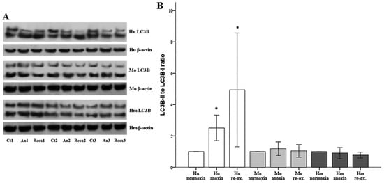 Autophagy in human, mouse, and hamster RPTECs under anoxia or reoxygenation. Autophagy was evaluated by the LC3B-II to LC3B-I ratio, assessed by Western blotting. In panel (A) three representatives of the nine performed experiments are depicted. Autophagy was observed only in human RPTECs under both anoxia and reoxygenation. Neither in mouse nor in hamster RPTECs did anoxia or reoxygenation induce autophagy (B). Hu: human; Mo: mouse; and Hm: hamster. Asterisk indicates a p < 0.05 compared to the control cultured under normoxia cells, and error bars correspond to SD.