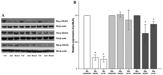 Necroptosis in human, mouse, and hamster RPTECs under anoxia or reoxygenation. Necroptosis was evaluated by the level of p-MLKL assessed by Western blotting. In panel (A), three representatives of the nine performed experiments are depicted. Necroptosis was not observed in any of the evaluated cells under anoxia or reoxygenation. Phosphorylated MLKL decreased in human and hamster RPTECs under both conditions, and remained unaltered in mouse RPTECs (B). Hu: human; Mo: mouse; and Hm: hamster. Asterisk indicates a p < 0.05 compared to the control cultured under normoxia cells, and error bars correspond to SD.