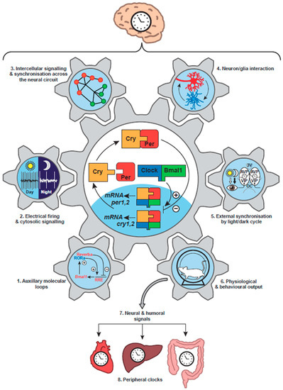 - Hastings, M.H.; Maywood, E.S.; Brancaccio, M. Generation of circadian rhythms in the suprachiasmatic nucleus. Nat. Rev. Neurosci. 2018, 19, 453–469. [Google Scholar] [CrossRef]