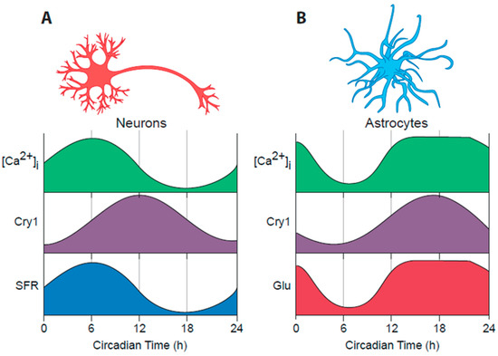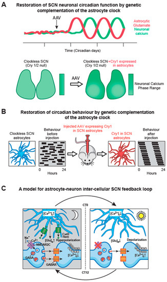 - Brancaccio, M.; Patton, A.P.; Chesham, J.E.; Maywood, E.S.; Hastings, M.H. Astrocytes control circadian timekeeping in the suprachiasmatic nucleus via glutamatergic signaling. Neuron 2017, 93, 1420–1435. [Google Scholar] [CrossRef]