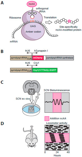 - Maywood, E.S.; Elliott, T.S.; Patton, A.P.; Krogager, T.P.; Chesham, J.E.; Ernst, R.J.; Beranek, V.; Brancaccio, M.; Chin, J.W.; Hastings, M.H. Translational switching of cry1 protein expression confers reversible control of circadian behavior in arrhythmic cry-deficient mice. Proc. Natl. Acad. Sci. USA 2018, 115, E12388–E12397. [Google Scholar] [CrossRef]