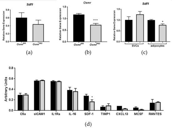 Stromal-derived factor 1 (SDF-1) expression is decreased in epididymal adipose tissue (eWAT) from OsmrFKO mice. Gene expression was analyzed in (a) eWAT from chow-fed OsmrFKO or floxed Osmr (control) mice (n = 6–8/genotype). (b) Osmr knockdown confirmation in eWAT from high fat diet-fed mice (n = 6–8/genotype). (c) Fractionated eWAT from high-fat-diet-fed OsmrFKO mice (n = 2–3 pooled samples/genotype containing tissue from 2–3 mice per sample) and expression levels were normalized to Ppia. (d) Protein levels of various cytokines and chemokines were assessed in eWAT from OsmrFKO and control mice fed a high-fat diet (n = 6/genotype). Black bars = control (floxed) animals; gray bars = OsmrFKO. * p < 0.05, **** p < 0.001 vs. floxed controls.