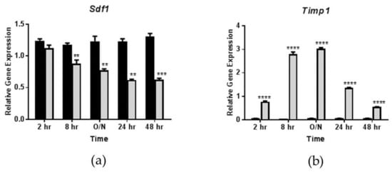 Oncostatin M (OSM) suppresses adipocyte Sdf1 expression in a time-dependent manner. Fully differentiated 3T3-L1 adipocytes were exposed to 0.5 nM OSM for 2 h, 8 h, ~12 h (overnight; O/N), 24 h, or 48 h. Gene expression was then analyzed and expression levels were normalized to a numerical average of three housekeeping genes (Ppia, Ubb, and Nono). (a) Effects of 0.5 nM OSM on Sdf1 expression in 3T3-L1 adipocytes; (b) Effects of OSM on Timp1 expression in 3T3-L1 adipocytes (shown as a positive control). Black bars = vehicle-treated cells; gray bars = OSM-treated cells. ** p < 0.01, *** p < 0.001, and **** p < 0.0001 vs. vehicle control. This experiment was performed twice.