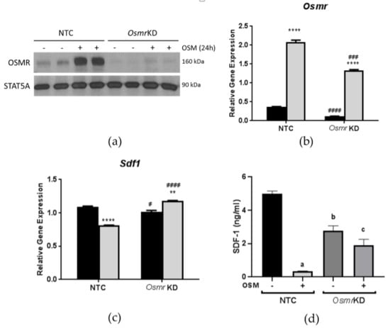 Oncostatin M receptor (OSMR) is required for Sdf1 suppression in adipocytes. Fully-differentiated 3T3-L1 adipocytes were transfected with siOsmr or a non-targeted control siRNA; 48 h after transfection, cells were exposed to 0.5 nM OSM for 24 h. Gene expression was then analyzed and expression levels were normalized to a numerical average of three housekeeping genes (Ppia, Ubb, and Nono). (a,b) Efficiency of OSMR knockdown. (c) The suppressive effect of OSM on Sdf1 expression is lost with OSMR silencing. (d) Effects of OSMR knockdown on SDF-1 secretion into culture media. In panels (a,b), black bars = vehicle-treated cells; gray bars = OSM-treated cells. KD = knockdown. ** p < 0.01 and **** p < 0.0001 vs. vehicle controls. # p < 0.05, ## p < 0.01, and #### p < 0.0001 vs. NTC. In panel (d), a = p < 0.001 vs. NTC; b = p < 0.01 vs. NTC; c = p < 0.05 vs. NTC + OSM. This experiment was performed twice.