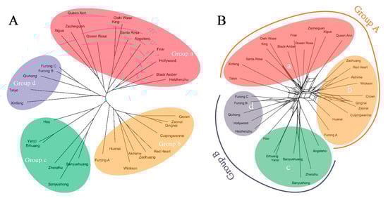 Genetic relationships of the 33 varieties are presented in Figure 1. The unrooted tree based on NJ method divided them into four groups (Figure 1A), many of which are coincided with geographic locations. Unrooted phylogenetic trees based on genetic distances of genotypes are generally used for inferring evolutionary relationships. Most of such phylogenetic trees are unable to display some parameters, such as horizontal gene transfer, hybridization, and recombination [29]. As a result, phylogenetic networks (NNet) analysis was used to explain visualized conflicting signals in the data sets, whether they arise from sampling error or genuine recombination [40,41]. The NNet analysis categorized the cultivars into two groups, which again show the territoriality (Figure 1B). Group A was dominated by Gutian population comprising Fengmeiting and Cuipinghu subgroups. Group B was dominated by Yongtai population consisting of Meilipu and Guopuchang subgroups. There are some disagreements between unrooted phylogenetic tree and NNet methods in clustering a few varieties. The unrooted tree shows that Sanyuehong, Sanyuehuang, and Xinfeng derived from Gutian were in the Yongtai population clusters, while Angeleno and Hollywood from Yongtai were situated in the Gutian population clusters. The NNet analysis shows that Heizhenzhu, Sanyuehong, and Sanyuehuang from Gutian were classified into the Yongtai population clusters. As the NNet analysis based on split networks adds extra topology-related parameters to phylogenetic analysis, allowing the constructed network to fit the data better than unrooted trees [29,40], the results of phylogenetic networks are inclined to territoriality than that of the NJ phylogenetic tree. Group A (Figure 1B) has 21 varieties, of which 11 are introduced from either Japan or the U.S. and the rest are native to Fujian, except Zaohuang, which is from Anhui Province. Group B has 12 varieties, and they are largely native to Fujian or South China, except Angeleno and Hollywood, which were introduced from the U.S.
