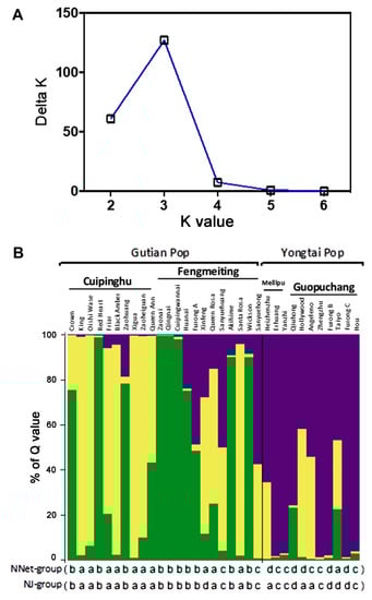 Bayesian analysis assigned individuals to RPPs based on genotype, and the Structure version 2.2.3 program [30] estimated the most likely number of cluster (K) by calculating the log probability of data for each value of K and using ΔK statistics described by Evanno et al. [32]. Results showed there was a sharp peak ΔK at K = 3 (Figure 3A), which indicated there were three genetic components, which provided the rationality for classifying the 33 genotypes into three RPPs or populations. In the bar plot of Figure 3B, varieties colored by yellow mainly belonged to the Cuipinghu population, by green largely as the Fengmeiting population, and purple as the Guopuchang and Meilipu populations. Comparing the results of the Structure analysis with NJ and NNet analyses (Figure 3B), varieties clustered in group a in NNet or NJ analysis were primarily yellow in color in the bar plot, group b in green, and groups c and d in purple. The three genetic components were based on the probability of germplasm originated from a specific population. Twenty-five genotypes were relative single according to the ‘Q > 0.6 relative to that of the single’ standard [37,38], and another eight genotypes were more complex, which comprise of Queen Ann, Furong A, Queen Rosa, Sanyuehuang, Sanyuehong, Hollywood, Angeleno, and Taiyo.