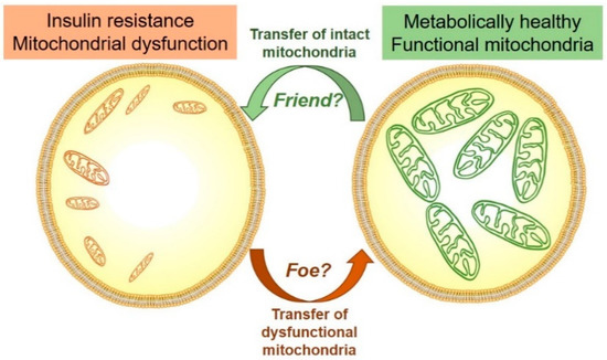 Is mitochondrial transfer in states of insulin resistance and mitochondrial dysfunction a friend or foe? In other pathological conditions, it has been shown that cells with mitochondrial impairments have the capacity to secrete mitochondrial cargo within exosomes that then impairs metabolic state of the recipient cells (i.e., foe). Other studies suggest that ‘healthy’ cells secrete mitochondrial cargo to improve the recipients cell metabolism (i.e., friend). Future studies will have to show if these phenomena are present states of mitochondrial dysfunction and insulin resistance.
