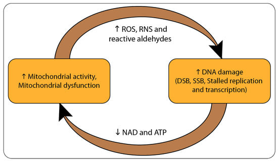 It has long been known that byproducts of cellular metabolism such as reactive oxygen and nitrogen species (ROS and RNS) can damage cellular components and macromolecules including DNA [8,9]. Damage to DNA can have severe effects on cells by blocking replication, transcription, generation of DNA double and single strand breaks, as well as chromosome rearrangements [10,11]. Activation of the DNA damage response (DDR) following DNA damage is an energy-demanding process [12], and can deplete cells of substrates such as NAD+ and ATP, which can in turn lead to additional metabolic stress and mitochondrial dysfunction (Figure 1) [13,14,15].