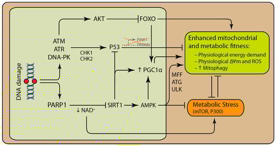 Core DNA damage response proteins are able to influence mitochondrial activity and quality control via multiple pathways. Abnormal DNA structure and certain genomic lesions, such as strand breaks, activate poly (ADP-ribose) polymerase (PARP) enzymes, mainly PARP1. Chronic activation of PARP1 can deplete the cell of NAD+, which is a rate-limiting substrate for SIRT1. SIRT1 together with AMP-activated kinase (AMPK) can enhance metabolism and mitochondrial function by enhancing mitochondrial biogenesis and mitophagy. Activation of ataxia telangiectasia mutated (ATM), Rad3-related (ATR) and DNA-dependent protein kinase (DNA-PK) following DNA damage can promote the activation AKT and P53. Activation of AKT rewires cellular metabolism by inhibiting Forkhead box (FOXO) enzymes. Deacetylation of P53 by SIRT1 targets P53 for degradation. Decrease in SIRT1 activity stabilizes P53. P53 decreases mitophagy via inhibition of PTEN-induced kinase 1 (PINK1) and PARKIN transcription. SIRT1 promotes AMPK activity indirectly. Decrease in SIRT1 activity is followed by the decrease in activated AMPK.