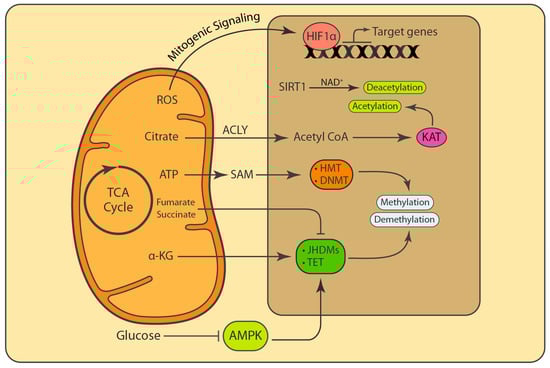 The multiple enzymatic systems assuring the generation and maintenance of epigenetic patterns include DNA methyltransferases, histone acetylases, deacetylases, methylases, and demethylases, as well as protein complexes implicated in chromatin remodeling. Most PTMs, such as phosphorylation, acetylation, methylation, and O-linked N-acetylglucosamine modification (O-GlcNAcylation), require metabolites as substrates [75]. If not all, the majority of substrates required for PTMs are intermediate metabolites generated by mitochondria [54]. Chromatin modifiers use metabolic intermediates as cofactors or substrates, but are also regulated by their availability. These metabolites include NAD+ for deacetylation, acetyl-CoA for histone acetylation, S-adenosylmethionine (SAM) for histone as well as DNA methylation, and α-ketoglutarate (α-KG) for demethylation [54].
