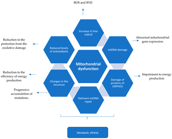 Important to mention is that mitochondrial DNA damage is amplified during the process of expansion of the clones (with deletions or mutations), changing the levels of heteroplasmy of the tissue [51,59]. This process increases the failure to provide appropriate energy supply for the tissue, contributing to the death of the cells [90].