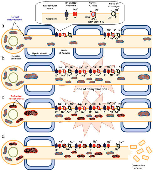 The role of mitochondria in the process of neurodegeneration. a. Normal nerve. b. Site of demyelination with secondary modification of the distribution of ion channels in the nerve. c. Structural and functional modification in mitochondria caused by oxidative stress. d. Cascade of apoptosis activated by Ca2+. Figure reprinted with permission from the article “Involvement of Mitochondria in Neurodegeneration in Multiple Sclerosis”, Kozin et al., Biochemistry (Moscow), 2018, Vol. 83, No. 7, pp. 813–830 [4].