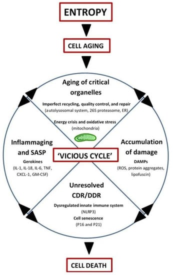 In summary, aging may be driven by entropy and manifests as a progressive accumulation of molecules with altered energy states, rendering them inactive or malfunctioning, prone to posttranslational modifications (e.g., oxidation, acetylation, methylation, glycation, etc.), cross-linking, and aggregation, and ultimately resistant to normal recycling mechanisms (for example, advanced glycation end products (AGEs) and lipofuscin). While mitochondria still remain central to the biological aging process in this view (by virtue of altered ROS and energy production), other organelles involved in recycling and quality control/repair also age, thus contributing to the ‘vicious cycle’ of debris accumulation, DAMP-activation of CDR/DDR, inflammation, and induction of cell-death (Figure 2).