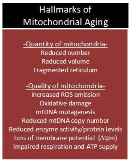 - Pak, J.W.; Herbst, A.; Bua, E.; Gokey, N.; McKenzie, D.; Aiken, J.M. Mitochondrial DNA mutations as a fundamental mechanism in physiological declines associated with aging. Aging Cell 2003, 2, 1–7. [Google Scholar] [CrossRef]