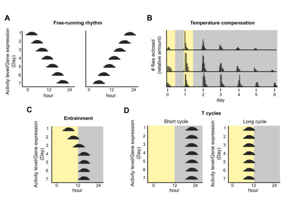 Characteristics of circadian clocks (see also [6]). (A) A free-running rhythm in constant conditions can have a period that is either slightly longer (left panel) or slightly shorter (right panel) than 24 h. Graphing the activity/amount (y-axis) over the course of the day (x-axis), such that changes from day to day are visually obvious (seen from top to bottom), facilitates an implicit understanding of period and phase of the circadian rhythm. (B) The eclosion of Drosophila occurs once per ca. 24 h in constant conditions following 2 days of entrainment in a 24 h light dark cycle (depicted as yellow and grey). The top of the panel shows eclosion at 26 °C, the middle shows 21 °C, and the bottom shows 16 °C. The timing of eclosion (and hence its period or frequency) remains almost the same over this broad range of physiological temperatures, and hence it is temperature compensated. Data are redrawn from Pittendrigh [7]. (C) The circadian rhythm entrains (synchronizes) to exactly 24 h in a zeitgeber cycle, shown here as a light-dark cycle. The rhythm gradually (days 1–4) finds a stable time of day (phase) relative to the zeitgeber (days 4–7). (D) T cycles are an experimental paradigm used to elucidate a biological clock. It places a rhythmic organism into entraining cycles of different lengths. The stable phase depends on the relationship between the period of the biological rhythm and the zeitgeber cycle. Most circadian rhythms entrain to a later phase in a shorter cycle and earlier phase in a longer one. Changes in phase angles in different T cycles are a hallmark of circadian clocks and occur regardless of the period length of the rhythm. These changes in phase angle distinguish circadian time—keeping from masking effects of the entrainment itself.