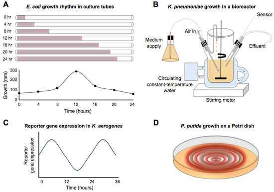 Schematic representations of the various rhythms observed for non-photosynthetic Eubacteria. (A) Growth rhythms observed in E. coli by growth in a long culture tube filled with liquid media and inoculated at one end. A dye was included to measure the growth front as the culture moves down the tube free-running rhythm. The graph summarizes the growth with 4 h intervals over 24 h, corresponding to hours 40 to 64 of the original experiment by Rogers and Greenbank [26]. Subsequent analysis of the data of the E. coli growth rhythm by Halberg and Conner suggests a 20.6 h period rather than 24 h [27]. (B) Sturtevant [30] measured the growth rhythm in Klebsiella pneuomoniae in a bioreactor. Samples were taken out every 15 or 30 min, and the optical density was measured. (C) Reporter gene rhythms detected in Klebsiella aerogenes [31]. A gene fusion between a motility gene (motA) and the reporter GFP allowed detection of circa 24 h rhythms. Similar types of long rhythms of reporter genes have been observed in B. subtilis [32,33,34,35]. (D) Morphological rhythms were observed by Soriano et al. [36] when studying Pseudomonas putida by incorporating dyes (Congo Red or Coomassie Brilliant Blue) that detect changes in the redox state or cell surface of P. putida. Growth “rings” were then observed that had circa 24 h rhythms.