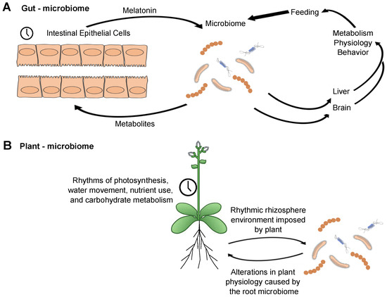 If gut microbial communities serve a function within a circadian system, then other well-characterized microbiomes/host arrangements might be expected to share some of the same principles. To that end, interactions between the root microbiome and circadian rhythms in plants have been reported. Clock regulation has a pervasive influence upon the physiology and development of plants, regulating processes ranging from the season of flowering to daily cycles of photosynthesis, stomatal opening, energy supply during the night, and fitness [82,83,84,85,86]. Cultivation of Arabidopsis short or long period clock mutants on soil led to alterations in the microbiome composition compared with the composition of the microbiome surrounding wild type plant roots [87]. Conversely, wild type plants had decreased leaf rosette diameter and delayed germination when cultivated on soil that was previously used to grow circadian clock mutants. One potential explanation is that mutants with an altered free-running period associate an altered microbiome, and this particular microbial community provides fewer benefits to the plant (here, assessed as from ‘conditioned’ soil) [87].