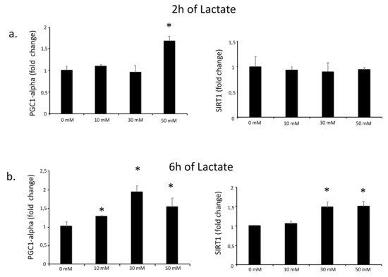 qPCR analysis of PGC1-alpha and SIRT1 expression in C2C12 myotubes cultured with L-lactate. C2C12 myotubes were cultured for 2 (a) and 6 h (b) with L-lactate at different concentrations (0, 10, 30, and 50 mM). In the time between lactate culture and sample collection (one hour), cells were cultured with DM. Error bars show standard deviations. * p < 0.05 from 0 mM. All the experiments were performed three independent times with three replicates each time.