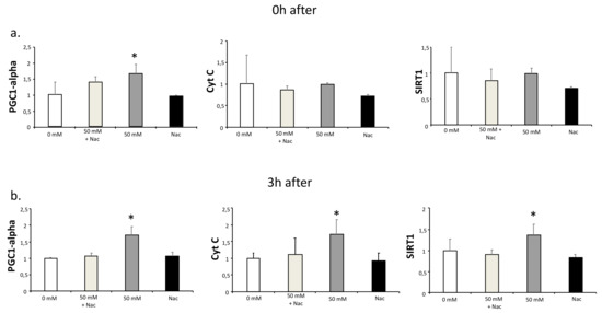 qPCR analysis of PGC1-alpha, Cyt C, and SIRT1 in C2C12 myotubes cultured with lactate and N-acetyl-L-cysteine (Nac). C2C12 myotubes were cultured for 2 h with L-lactate (0 and 50 mM) in the presence or absence of Nac (2 mM). Samples for gene expression analysis were obtained at 0 (a) and 3 h (b) after the culture with lactate and Nac. In the time between lactate culture and sample collection (0 to 3 h), cells were cultured with DM. Error bars show standard deviations. * p < 0.05 from 0 mM. All the experiments were performed three independent times with three replicates each time.