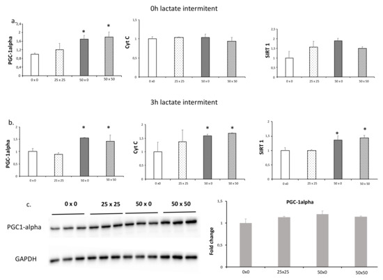 Immediately after the lactate treatment, PGC1-alpha was equally up-regulated at 50 × 0 and 50 × 50 conditions (Figure 3a), indicating that intermittent (50 × 0) and continuous (50 × 50) exposure have similar effects. Cyt C and SIRT1 were only up-regulated 3 hours after in 50 × 0 and 50 × 50 conditions (Figure 3a). It was reported that 30 min was enough to increase PGC1-alpha protein levels (20%) in skeletal muscles after exercise with an increase (40%) until 5 h [21]. In the present study, we evaluated the PGC1-alpha expression and protein levels three hours after the two-hour culture, and we found PGC1-alpha expression was still up-regulated in 50 × 0 and 50 × 50 conditions (Figure 3b). Finally, western blotting showed that PGC1-alpha protein levels 3 hours after lactate exposure were unchanged between intermittent and continuous exposure (Figure 3c).