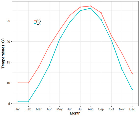Monthly mean water temperature at two sampling locations. VA = Corrotoman River, Virginia, SC = Charleston, South Carolina.