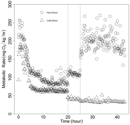 Time course of metabolic rate change in spotted seatrout under two sets of experimental conditions. Empty circles: heat stress; empty triangles: cold stress. Each dot represents the oxygen consumption rate from one respirometry cycle. Vertical dotted lines separate different temperatures. Within each treatment, from left to right: 20 °C, 25 °C, 30 °C (heat stress); 15 °C, 10 °C, 5 °C (cold stress).
