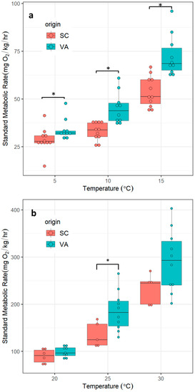SMR of spotted seatrout from two genetically distinct populations measured at six discrete temperatures. SC = southern population, VA = northern population. (a) cold stress; (b) heat stress. Asterisks indicate significant differences between groups (p ≤ 0.05, two tailed Student’s t-test).