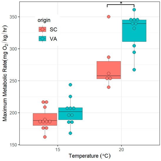 MMR of spotted seatrout from two genetically distinct populations measured at 15 °C and 20 °C. SC = southern population, VA = northern population. Asterisks indicate significant differences between groups (p ≤ 0.05, two tailed Student’s t-test).