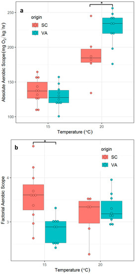 Absolute aerobic scope (AAS, a) and factorial aerobic scope (FAS, b) between two northern and southern spotted seatrout populations, at 15 °C and 20 °C. SC = southern population, VA = northern population. Asterisks indicate significant differences between groups (p ≤ 0.05, two tailed Student’s t-test).