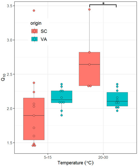 The Q10 ranged between 1.4 and 3.4 among SC fish and 1.9 to 2.4 among VA fish. There were no significant differences in Q10 between the two populations at temperatures between 5 °C and 15 °C, (t18 = 1.2, p = 0.32). There was, however, a significant difference in Q10 between the two populations between 20 °C and 30 °C (t13 = 3.77, p = 0.0025) (Figure 6).