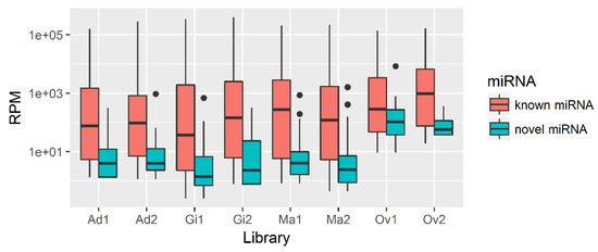 The total miRNA reads of each library were used for normalization to analyze differentially expressed miRNAs between two tissues’ libraries. The miRNA counts were normalized according to the reads per million reads (RPM) method. The expression levels of known and novel miRNAs in the various tissues were compared to identify differentially expressed miRNAs. DESeq2 software (version 1.14.1) [38] was used to analyze the differences in the expression levels of the miRNAs between two tissues with the criteria: |log2(FoldChange)| > 1 and p-adj < 0.05. Six paired comparisons were evaluated by DESeq2, including Ad vs. Gi, Ad vs. Ov, Ad vs. Ma, Gi vs. Ov, Gi vs. Ma, and Ov vs. Ma. Each tissue had two individuals as replicates.