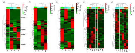Heat map of expression levels of miRNAs in P. fucata somatic and ovary tissues, based on (a) average expression levels of the two individuals, (b) individual expression levels of individual 1, (c) individual expression levels of individual 2, (d) all examined samples of the two individuals, and (e) six somatic samples of the two individuals. The details regarding miRNA expression are shown in Table S2. RPM: reads per million reads. Ad: adductor muscle; Gi: gill; Ov: ovary; Ma: mantle.