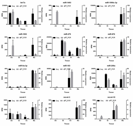qRT-PCR validation of miRNAs expressed in P. fucata somatic and ovary tissues. Ad: adductor muscle; Gi: gill; Ov: ovary; Ma: mantle; RPM: reads per million reads; Seq: high-throughput sequencing.