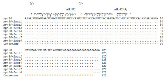 The predicted interactions of miR-872 and miR-463-3p with the 3′ untranslated regions (UTRs) of MPN88 family genes. The target sites of miR-872 (a) and miR-463-3p (b) in the 3′UTRs of eight MPN88 family genes identified by RNA22 and RNAhybrid, respectively.