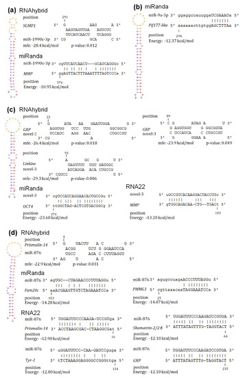 Hairpin structure of miRNAs and the potential target sites. (a) The potential target sites between miRNA-1990c-3p and MMP by miRanda, and between miRNA-1990c-3p and SGMP1 by RNAhybrid. (b) The potential target site between miR-9a-3p and Pif177-like protein by miRanda. (c) The potential target sites between novel-3 and GRP, between novel-3 and Linkine by RNAhybrid, and between novel-3 and OCT4 by miRanda, and between novel-3 and MMP by RNA22. (d) The potential target sites between miR-876 and Prismalin-14 by RNAhybrid and RNA22, and between miR-876 and Fam20c, between miR-876 and PMMG1 by miRanda, between miR-876 and GRP, between miR-876 and shematrin-2/2β, and between miR-876 and Tyr-1 by RNA22. The position of target genes is numbered from the 3′UTR starting position.