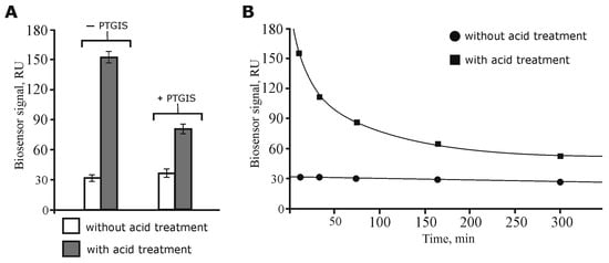 A lysate sample without acid treatment was used as a control. A sample containing 10 μL of lysate (4 mg/mL) and 190 μL of 1X buffer A was incubated on ice for 1 min. Then, an aliquot of 200 μL of 2× buffer B was added to a final sample volume of 400 μL. In the additional experiments, exogenous PTGIS protein was added in both lysate samples to its final concentration of 50 μg/mL after the pH value had been restored to 7.4 (Table S1, Supplementary File 1). All lysate samples were injected over the optical chip surface with immobilized PTGIS for 1 min at a flow rate of 3 μL/min. Regeneration solution was injected for 30 s at a flow rate of 30 μL/min to regenerate the chip surface after each lysate injection.