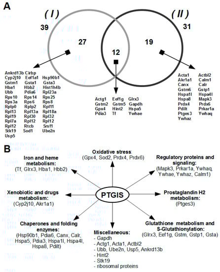 Proteins isolated and identified from the lysate by direct molecular fishing procedure using PTGIS as a bait protein: (A) Final listing of potential protein partners of PTGIS isolated from intact (I) and acid-treated (II) testis tissue lysate using affine sorbent (with immobilized PTGIS protein) by excluding proteins non-specifically bound to empty sorbent (without PTGIS). (B) The main functional roles of potential protein partners of PTGIS.