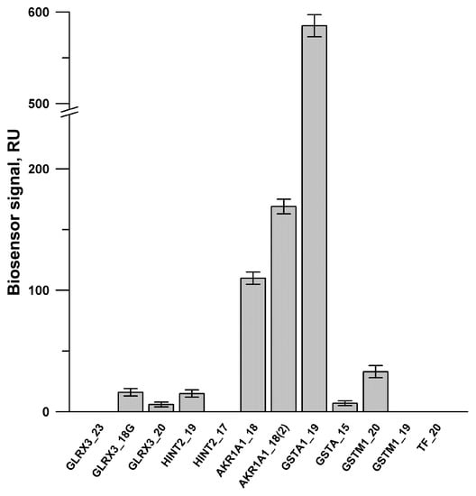 SPR screening of the binding capability of twelve peptides synthesized with immobilized PTGIS on the optical chip is presented in Figure 3. It was shown that positive binding signals were observed for the peptides derived from GSTA1, AKR1A1, GLRX3, GSTM1, HINT2 (Figure 3). Further SPR experiments confirmed that the peptide binding with PTGIS in a concentration-dependent manner was observed only for four peptides GSTA1_19, AKR1A1_18, AKR1A1_18 (2) and GLRX3_18. Apparent Kd values of PTGIS/peptide complexes were calculated in the range of 10−5 M–10−6 M (Figure S3–S6; see Supplementary File 1). Using the jsPISA 2.0.5 program (http://www.ccp4.ac.uk/pisa/) [52] for structural analysis of protein–protein interfaces of GSTA1 (PDB ID 1k3y), we found that peptide GSTA1_19 67QTRAILNYIASKYNLYGKD86 contains amino acid residues that are critical for the interface contacts of two GSTA1 monomers (Table S3, see Supplementary File 1). In contrast, peptide GSTA1_15 208MDEKSLEEARKIFRF222 did not contain any amino acid residues involved in the homodimerization of GSTA1 protein. SPR analysis revealed that only “interfacial” peptide GSTA1_19 interacted with PTGIS (Figure S3, see Supplementary File 1). Thus, we have shown for the first time that prostacyclin synthase, can form a heterocomplex with the monomeric form of glutathione S-transferase, presumably due to the involvement of amino acid residues in the GST/GST homodimerization interface, whereas PTGIS does not interact with the dimeric form of GST.