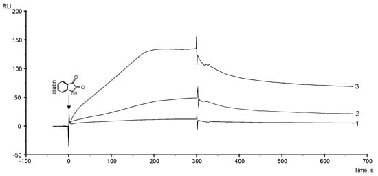SPR sensorgrams of isatin interaction with PTGIS immobilized on the SA chip using the streptavidin–biotin coupling protocol. Biosensor signals represent the difference between working and control channels. About 9000 RU (approximately 9 ng) of biotinylated PTGIS was immobilized on the SA chip. The following concentration of isatin were injected for 5 min at a flow rate of 10 µL/mL: (1) −43 µM, (2) −86 µM, (3) 129 µM. HBS-EP+ buffer was used as a running buffer.