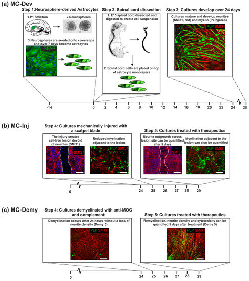 The repair of the central nervous system (CNS) is a complex process, which requires a multifactorial approach. Identifying molecules that promote CNS repair is an important aspect of developing therapies for regenerative medicine. We have devised a mixed neural cell culture that can be used to study developmental myelination, neurite outgrowth, and re/myelination after injury. The cultures are generated from dissociated embryonic rat spinal cords and develop over time to form many myelinated internodes separated by nodes of Ranvier [1]. They have allowed us to examine factors that regulate the process of myelination over time and we have, therefore, termed them myelinating cultures-development (MC-Dev). These cultures have been used to study the interaction between oligodendrocytes and axons during the process of myelination [2] and lead to the identification of the novel function of chemokines as regulators of myelination. Notably, C-X-C motif chemokine 10 [3] and connective tissue growth factor [4] can inhibit the development of myelination, while C-X-C motif chemokine 12 can promote myelination [5,6].
