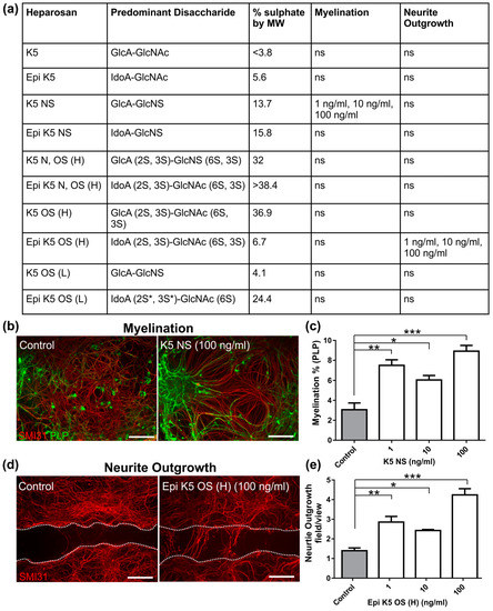 Tables detailing the panel of heparosans used in this investigation are shown in Figure 2a. MC-Inj cultures were treated with a titration of each heparosan (1, 10, and 100 ng/mL) followed by an assessment of myelination and neurite outgrowth (summarised in Figure 2a). K5 NS at 1 ng/mL, 10 ng/mL, and 100 ng/mL was the only heparosan found to significantly promote myelination (~3 fold) compared to the non-treated control cultures (p = 0.0015, p = 0.015 and p = 0.0003, respectively; Figure 2b,c). However, its epimerised form did not have a similar pro-myelinating effect, suggesting that the conformation of the uronic acid residue is important for function. Interestingly, neither forms of this heparosans had any effect on neurite outgrowth. Conversely, O-sulphated heparosan Epi K5 OS (H) promoted neurite outgrowth compared to the non-treated control cultures (Figure 2d,e). Epi K5 OS (H) treatments at 1 ng/mL, 10 ng/mL, and 100 ng/mL resulted in a significantly increased neurite outgrowth of 51%, 43%, and 67%, respectively (p = 0.0048, p = 0.030 and p = 0.0001, respectively). These data imply that epimerisation is also a vital heparosan modification for the observed effect on neurite outgrowth.