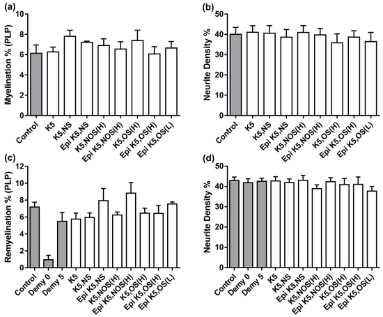 The same panel of heparosans (detailed in Figure 2a) was used to treat MC-Dev and were found to have no effect on developmental myelination or on neurite density, similar to results previously published by us using sulphated polysaccharides [10] (Figure 3a,b). This suggests that the beneficial effect on myelination following K5 NS treatment in the MC-Inj screen is unlikely to be a direct effect on the compounds ability to promote oligodendrocyte precursor cell (OPC) differentiation and/or the process of oligodendrocyte ensheathment of axons. To determine whether pro-myelinating effects could be observed in a different injury model, we tested the panel of heparosans using MC-Demy (Figure 3c,d). Cultures were treated with each compound at 1 nM to enable a direct comparison between compounds. However, at this concentration, there were no significant improvements in remyelination observed for any of the panel, with only a small trend towards an increase after Epi K5 NS and Epi K5 NOS (H) treatment (Figure 3c,d). A dose response for Epi K5 NS was carried out and demonstrated no significant effect on remyelination [39].