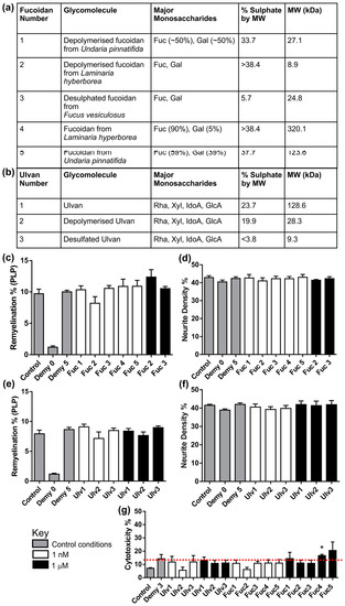Details of the panel of fucoidans and ulvans screened in MC-Demy are shown in Figure 4a,b. Fucoidans (Figure 4c,d) and ulvans (Figure 4e,f) were used to treat MC-Demy at 1 nM and 1 μM concentrations. None of the fucoidans or ulvans at either concentration had any effect on remyelination or neurite density. A toxicity screen was also carried out for each fucoidan and ulvan via collection of the growth medium from the cultures after treatment. This conditioned medium was assessed for cellular toxicity using a cytotox non-radioactive assay. It was found that treatments at the higher concentration of 1 µM for fucoidans 1, 4, and 5 (Fuc1, Fuc4, Fuc5) were toxic to cultures as indicated in the 28 DIV toxicity screen (Figure 4g). Conversely, none of the ulvans had any toxic effects even at 1 μM.